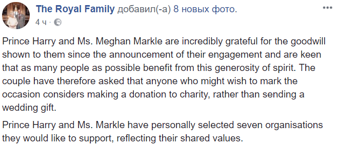"Они (Гарри и Меган - ред.) попросили, чтобы любой, кто хотел бы отметить этот праздник, сделал пожертвование на благотворительность, а не дарил свадебный подарок", - говорится в сообщении королевской семьи.