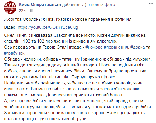 В воскресенье, 8 апреля, в Оболонском районе Киева произошла драка между двумя пьяными. В результате один из них получил сильное ножевое ранение в лицо.