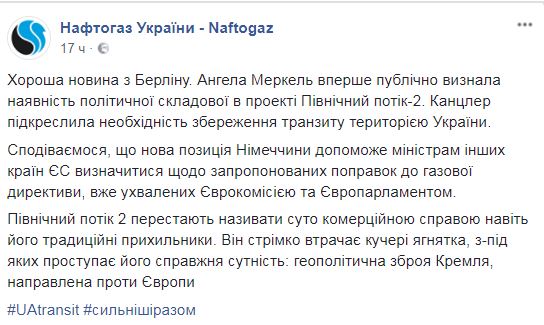 "Хорошая новость из Берлина. Ангела Меркель впервые публично признала наличие политической составляющей в проекте "Северный поток - 2". Канцлер подчеркнула необходимость сохранения транзита по территории Украины. Надеемся, что новая позиция Германии поможет министрам других стран ЕС определиться по предложенным поправкам к газовой директиве, уже принятых Еврокомиссией и Европарламентом", - говорится в сообщении.