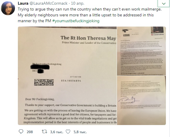 Пожилой супружеской паре, проживающей в Лондоне, пришло странное письмо от Консервативной партии Великобритании, подписанное премьер-министром страны Терезой Мэй. В документе к пожилому англичанину обращаются мистер Youmustbe Fuckingjoking (цензурно это можно перевести как Вычертвозьмидолжнобытьшутите).