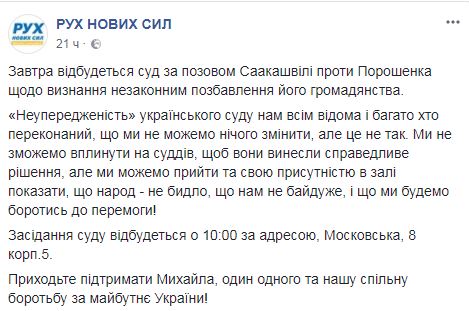 "13 апреля состоится суд по иску Саакашвили против Порошенко о признании незаконным лишения его гражданства. Заседание суда состоится в 10:00 по адресу, Московская, 8, корпус 5", - говорится в сообщении.
