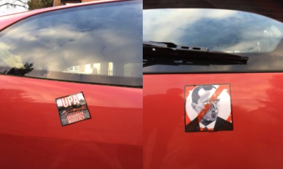 Оскорбительные наклейки были двух видов  - с зачеркнутым изображением Бандеры, а также надписью "УПА - украинские убийцы" на фоне горящих домов.