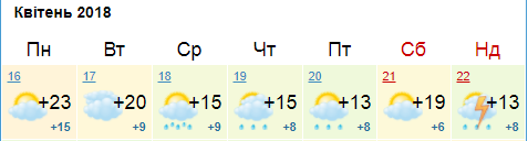 Ресурс Мeteoprog.ua обещает относительно сухую неделю. Небольшой дождь ожидается только в четверг, 19 апреля. По температуре эта неделя обещает следующие скачки: в понедельник-вторник +21...+23, в среду +16. Четверг станет самым холодным днем недели: +12. В пятницу +16, в субботу вновь потеплеет до +22, а в воскресенье температура снизится до +17.