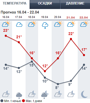 По данным сайта Sinoptik.ua, также обещает, что неделя начнется с +21...+23 днем. Со среды дневная температура опустится до +15...+16. На выходных в субботу потеплеет до +20, в воскресенье будет прохладно: +13 днем. Дожди обещают в среду, пятницу и воскресенье.
