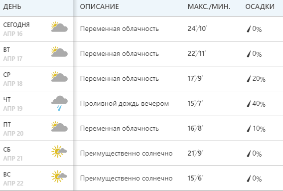 Сайт Weather.com сообщает, что температура понизится со среды, но всего на несколько градусов: +15...+17. Самый холодный день недели - четверг, в этот же день вероятны осадки.
