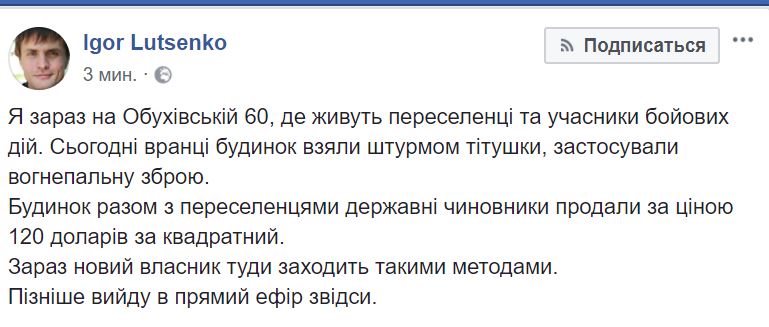 "Я сейчас на Обуховской 60, где живут переселенцы и участники боевых действий. Сегодня утром дом взяли штурмом титушки, применили огнестрельное оружие. Дом вместе с переселенцами государственные чиновники продали по цене 120 долларов за квадратный. Сейчас новый владелец туда заходит такими методами", - пишет Луценко.