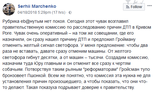 "Сегодня этот чувак возглавил правительственную комиссию по расследованию причин ДТП в Кривом Роге. Чувак очень оперативный – на том же совещании, где его назначили, он сразу нашел причину ДТП и предложил Гройсману отменить желтый сигнал светофора.