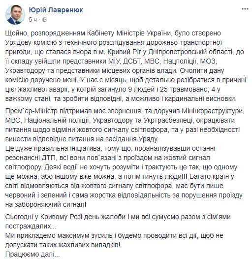 Правительственную комиссию по расследованию ДТП в Кривом Роге возглавил замминистра инфраструктуры Юрий Лавренюк.