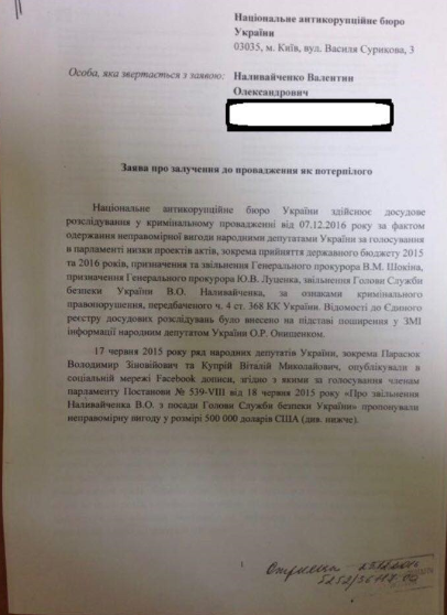 Напомню, что еще 23 декабря 2016 я обратился в НАБУ с заявлением о привлечении к данному уголовному производству меня, как потерпевшего (копия заявления прилагается вх.№252 / 36117-00 от 23.12.2016р.) И предоставил письменные доказательства. НАБУ обязано было рассмотреть данное заявление в срок не более трех дней (!), и принять соответствующее решение.