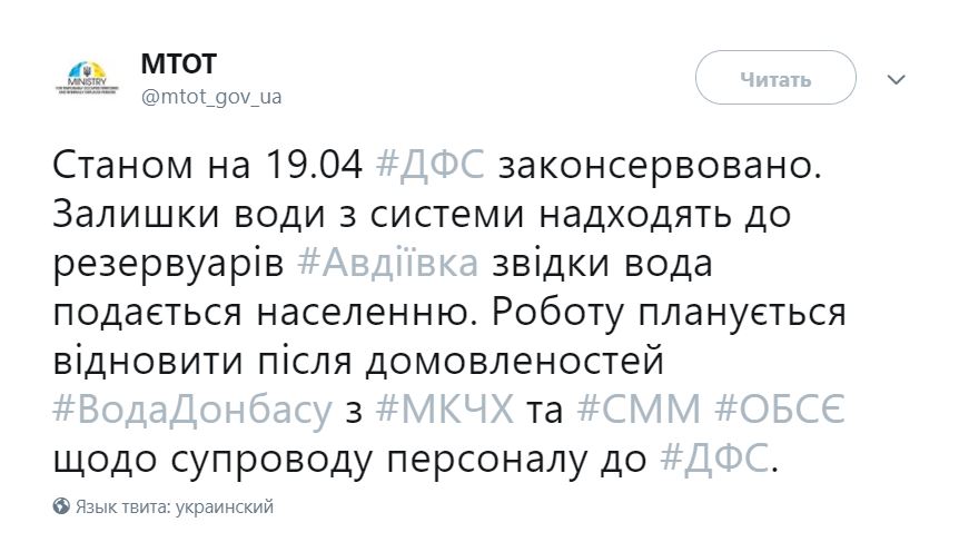 Также мы писали, что остатки воды из Донецкой фильтровальной станции по состоянию на 19 апреля поступают в резервуары Авдеевки.
