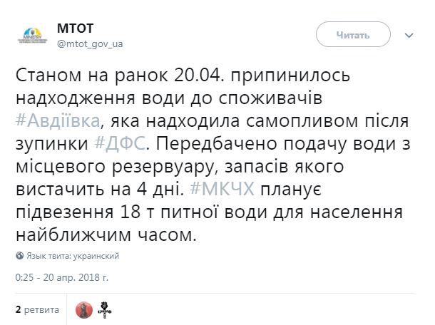 "По состоянию на утро 20.04. прекратилось поступление воды к потребителям Авдеевки, которая поступала самотеком после остановки ДФС", - говорится в сообщении.