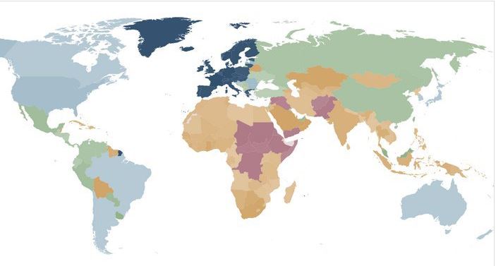 Темно-синий цвет - чрезвычайно высокая ценность гражданства, голубой - очень высокая, зеленый - высокая, оранжевый - средняя, красный - низкая Фото: henleyglobal.com