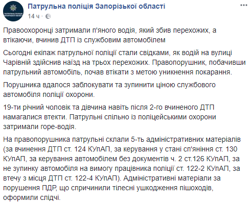 На правонарушителя патрульные составили пять административных материалов (за совершение ДТП в. 124 КУоАП, за управление в состоянии опьянения ст. 130 КУоАП, за управление автомобилем без документов ч. 2 ст.126 КУоАП, за неостановку автомобиля по требованию работника полиции ст. 122-2 КУоАП, за побег с места ДТП ст 122-4 КУоАП).