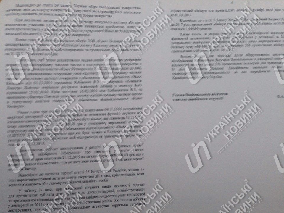 Кроме того, в разделе "Корпоративные права" Рабинович написал, что по состоянию на 31 декабря 2015 года ему принадлежало 50% (600 тыс. гривен в денежном выражении) прав в компании "Ньюс Нетворк".