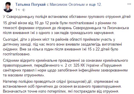 "Сегодня, дети из разных городов и районов области приняли участие в детском мероприятии, во время которого они употребляли заранее приготовленные завтраки. Уже через несколько часов после еды 15 из 22 детей были госпитализированы", - написала начальник отдела по связям с общественностью Главного управления Национальной полиции Украины в Луганской области Татьяна Погукай на своей странице в соцсети Facebook в пятницу.