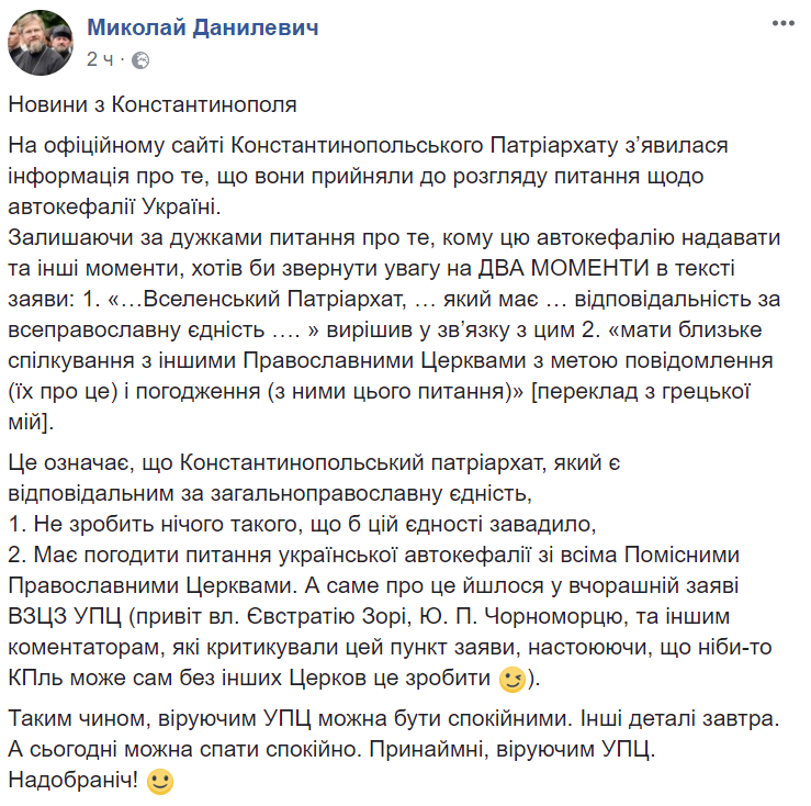 Глава отдела внешних церковных связей протоиерей Николай Данилевич считает, что в сообщении говорится не просто о консультациях, а именно о согласовании с другими церквями украинского вопроса.