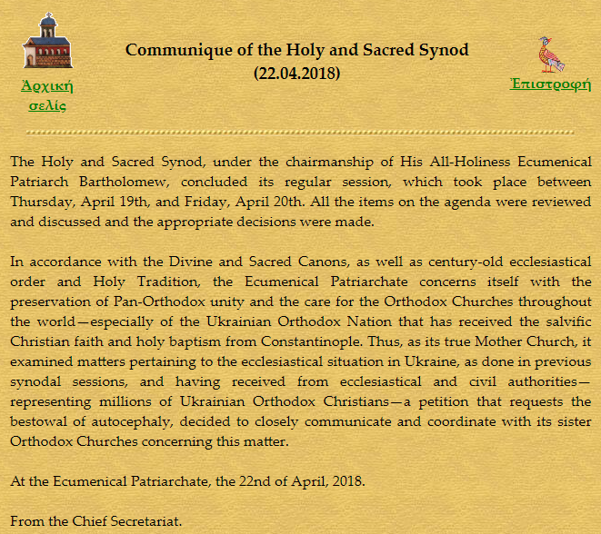 Текст Вселенского патриархата "Страна" уже публиковала. Вот это сообщение, которое размещено на сайте патриархии: