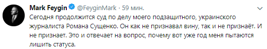 "Сегодня продолжится суд по делу моего подзащитного, украинского журналиста Романа Сущенко. Он как не признавал вину, так и не признаёт. И не признает. Это и отвечает на вопрос, почему вот уже год меня пытаются лишить статуса (адвоката - ред.)", - написал Фейгин.