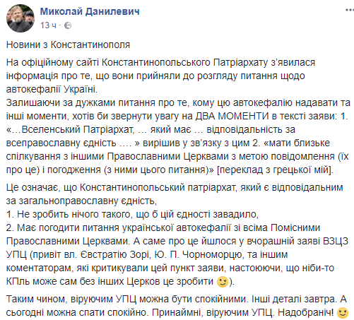 "Таким образом, верующим УПЦ можно быть спокойными. Другие детали завтра. А сегодня можно спать спокойно. По крайней мере, верующим УПЦ", - написал Данилевич вечером 22 апреля.