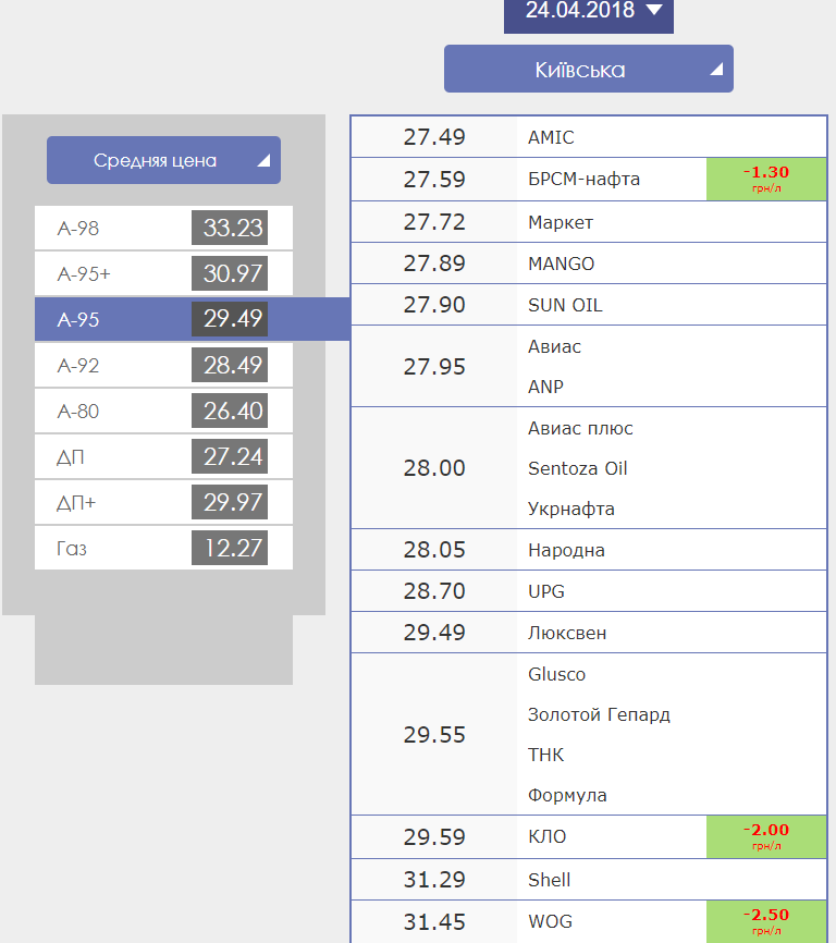 Пока нефть дорожает уже несколько месяцев подряд, в Украине с марта падают цены на бензин и дизтопливо. Если зимой цены на А-95 поднялись до 32-33 гривень, то сейчас они колеблются в пределах 27-29.