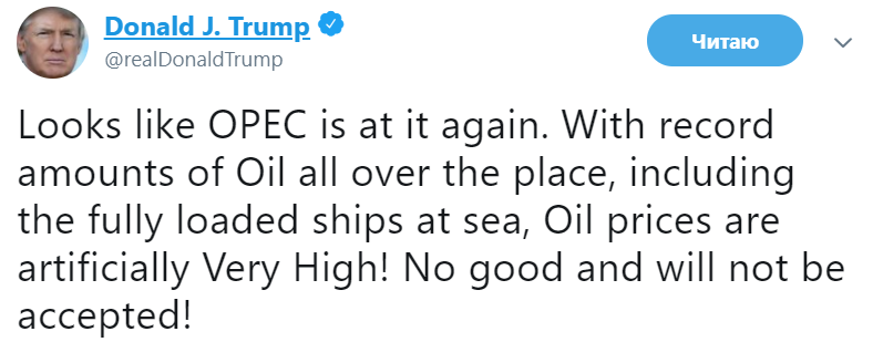 "Похоже, что ОПЕК опять этим занялась. С рекордным количеством нефти повсюду, включая забитые до отказа суда в море, цены на нефть являются искусственно очень завышенными! Это плохо и это недопустимо!" – написал он.