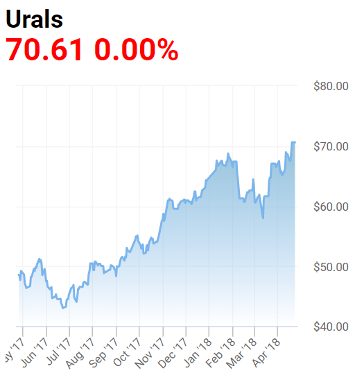 Динамика роста цены на нефть Urals за последние 12 месяцев.