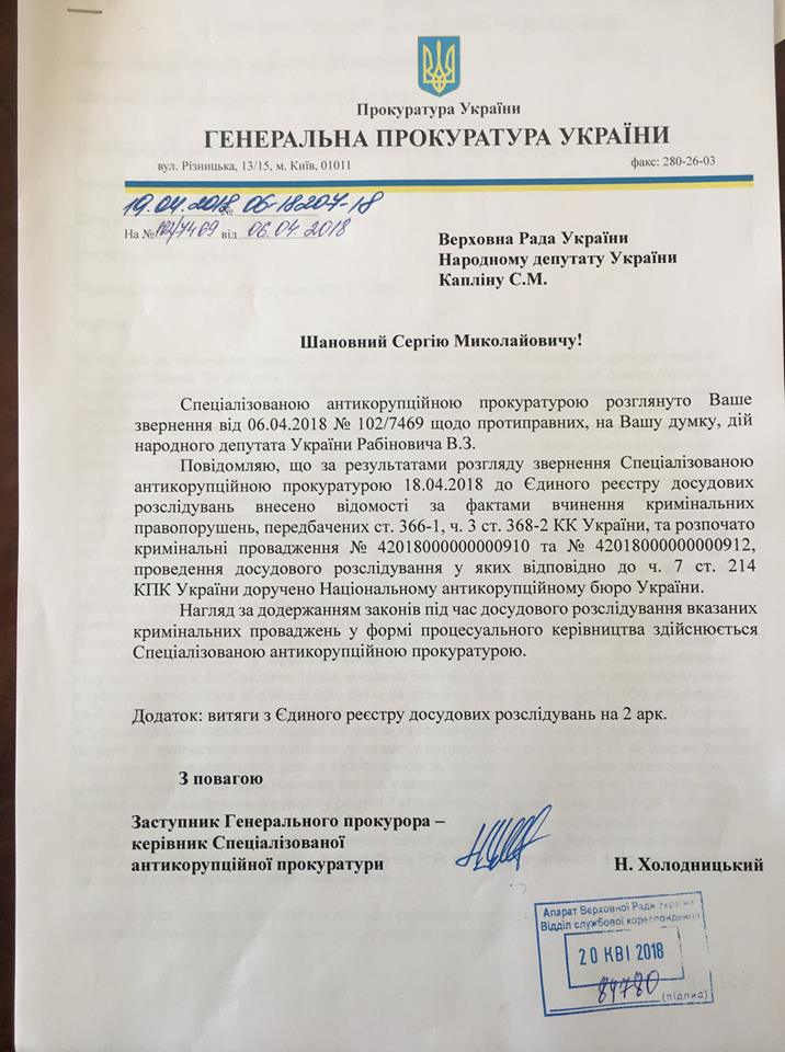 "18 апреля 2018 по моему заявлению открыты два новых уголовных производства по фактам незаконного обогащения и коррупции Давида-Вадима Рабиновича.