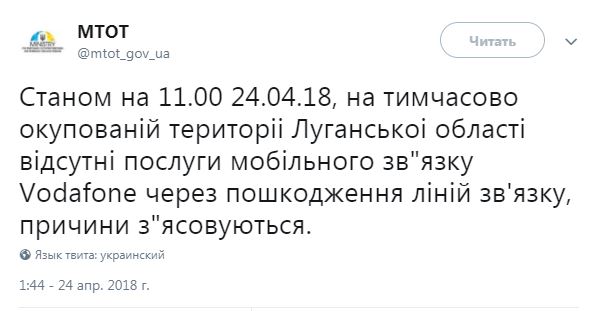 "По состоянию на 11:00 24.04.18, на временно оккупированной территории Луганской области отсутствуют услуги мобильной связи Vodafone из-за повреждения линий связи, причины выясняются", – отмечается в сообщении МинВОТ.