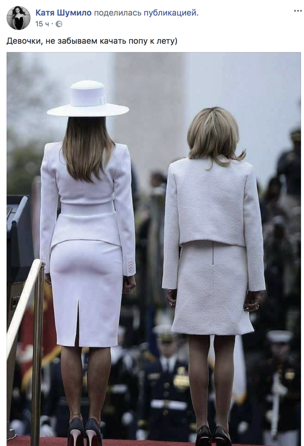 Фото двух первых леди, сделанное сзади тут же привлекло внимание пользователей соцсетей, которые принялись сравнивать жен президентов.