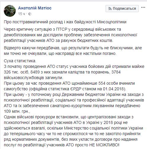 "За время проведения АТО по меньшей мере 554 человека совершили самоубийство (официальная статистика ЕРДР по состоянию на 01.04.2018)", — написал он.