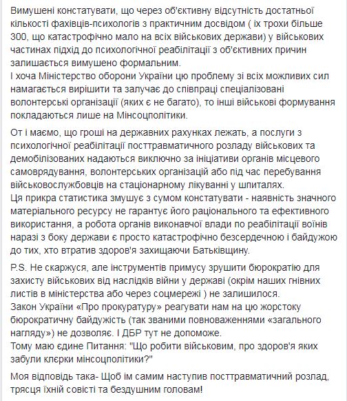 "Военные прокуроры установили, что централизованные мероприятия по психологической реабилитации участников боевых действий в Украине в 2018 году не осуществляются вообще, поскольку Министерство социальной политики Украины до сих пор то ли не смогло, то ли не захотело принять ряд нормативных документов, без которых заключить договоры о предоставлении услуг по реабилитации участников боевых действий просто невозможно!", — объяснил Матиос.