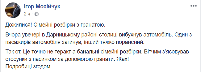 Версию о бытовых мотивах случившегося поддерживает и нардеп от Радикальной партии Игорь Мосийчук. Он назвал инцидент на Драгоманова "семейными разборками". "Это точно не теракт, а банальные семейные разборки. Отчим выяснял отношения с пасынком с помощью гранаты. Ужас!" – написал он в Facebook.