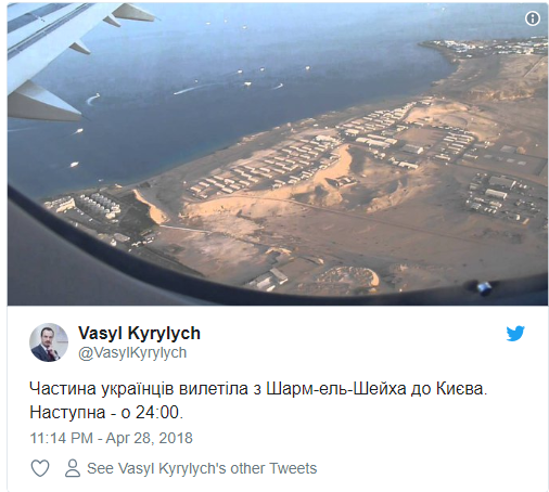 В 23:14 Кирилич добавил, что часть украинцев вылетела из Шарм-эль-Шейха в Киев и сообщил, что следующий рейс планируется в 24:00.