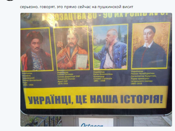 Отметим, что на фото слева направо на портретах изображены Богдан Хмельницкий, Иван Мазепа, Иван Сирко, Григорий Сковорода. Вместо этого они подписаны как Иван Грушевский, Симон Петлюра, Евгений Коновалец и Номан Челебиджихан.