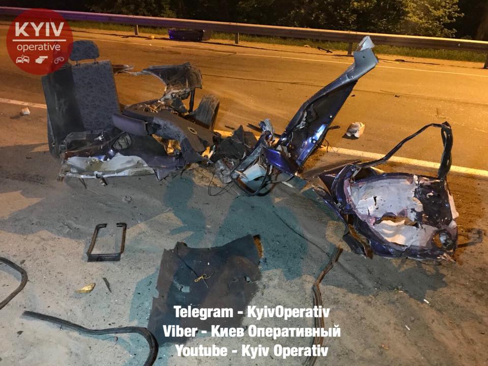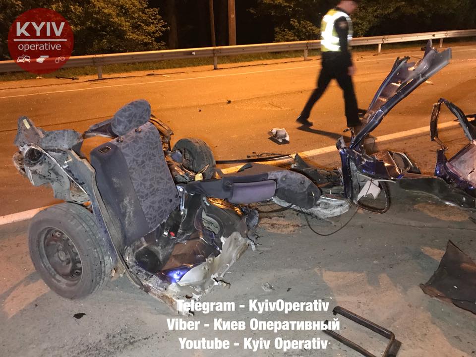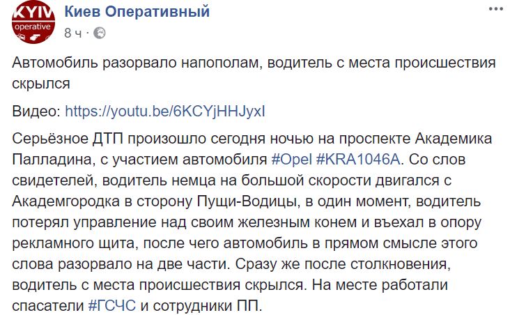 По словам патрульных, Opel двигался по Палладина в сторону Пущи-Водицы. По неизвестным причинам автомобиль занесло, после чего он врезался в опору рекламного щита. В результате столкновения машину разорвало на две части.