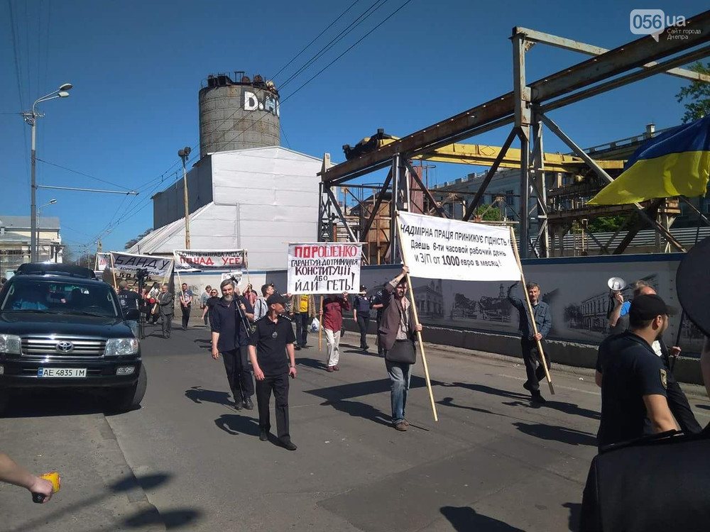 В Днепре первомайская демонстрация сопровождалась потасовками. Около 100 участников прошли маршем от Дома Союзов к зданию горсовета Днепра. Конфликт произошел из-за красного флага, который держали коммунисты. Участники держали в руках плакаты с лозунгами: "Порошенко, гарантируй соблюдение Конституции или уходи прочь", "Сверхурочная работа унижает достоинство. Даешь 6-часовой рабочий день и зарплату от 1 тысячи евро в месяц", "Банду геть".
