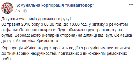 "2 мая, с 08:00 до 18:00 в связи с ремонтом асфальтобетонного покрытия будет ограничено движение транспорта на бульваре Академика Вернадского (нечетная сторона) на участке от ул.Семашко до ул. Академика Крымского", - заявили коммунальщики.