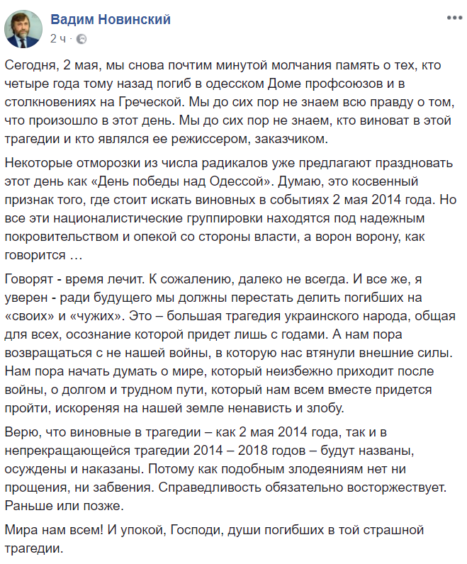 Нардеп Вадим Новинский считает, что призывы радикалов сделать 2 мая праздником, косвенно указывают на истинных виновников трагедии: "Некоторые отморозки из числа радикалов уже предлагают праздновать этот день как "День победы над Одессой". Думаю, это косвенный признак того, где стоит искать виновных в событиях 2 мая 2014 года. Но все эти националистические группировки находятся под надежным покровительством и опекой со стороны власти, а ворон ворону, как говорится..."