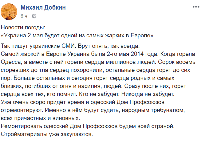 Нардеп Михаил Добкин считает, что судить причастных к трагедии 2 мая будут в одесском Доме профсоюзов: ""Уже очень скоро придёт время и одесский Дом Профсоюзов отремонтируют. Именно в нём будут судить, народным трибуналом, всех причастных и виновных. Ремонтировать одесский Дом Профсоюзов будем всей страной. Стройматериалы уже закупаются".
