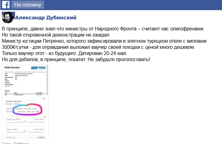 Но такой откровенной демонстрации не ожидал. Министр юстиции Петренко, которого зафиксировали в элитном турецком отеле с виллами 3000€/сутки - для оправдания выложил ваучер своей поездки с ценой много дешевле. Только ваучер этот - из будущего. Датирован 20-24 мая. Но для дебилов, в принципе, покатит. Не забудьте проголосовать", -аписал Дубинский в Facebook.
