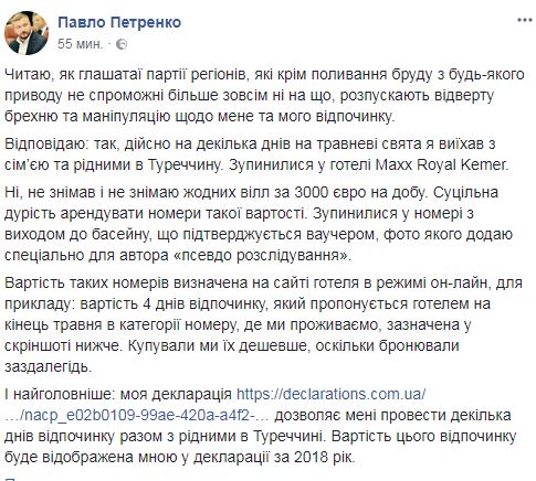 Министр юстиции Павла Петренко подтвердил, что на майские праздники выезжал с семьей в Турцию, но виллу за 3000 евро там не снимал.