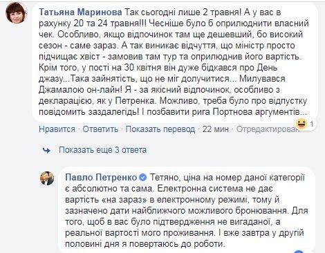 Пользователи сети при этом заметили, что даты в расчете стоимости проживания указаны на 20 и 24 мая, которые еще не наступили. На что Петренко ответил, что система не дает пример расчета "на сейчас", а стоимость номера, где он проживал - была такая же, то есть 773 евро.