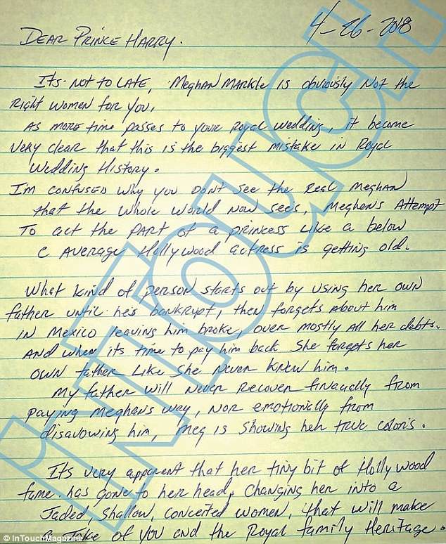 "Дорогой принц Гарри, еще не поздно, Меган Маркл – однозначно не является подходящей для тебя женщиной. Чем ближе к твоей королевской свадьбе, тем очевиднее, что это самая большая ошибка в истории королевских свадеб. Я озадачен, что ты не видишь настоящей Меган, какой ее уже видит весь мир ", – написал брат голливудской звезды.
