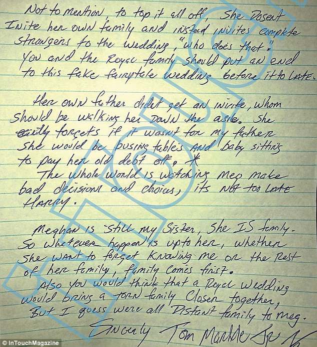 Также близкий родственник обвиняет Меган в том, что она использовала их отца, доведя его до банкротства и оставив на произвол. Дочь забыла о нем и даже не позвала на свадьбу, хотя именно он должен вести ее к алтарю.