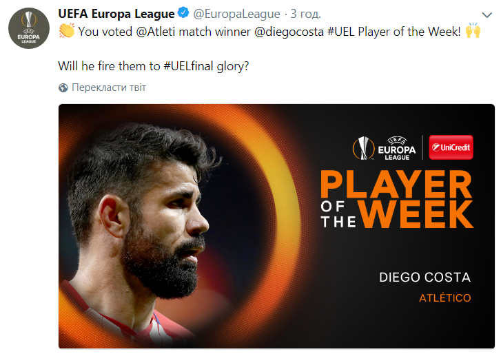 "Лучшим игроком недели в Лиге Европы стал форвард "Атлетико" Диего Коста", - гласит официальный аккаунт турнира в Twitter.