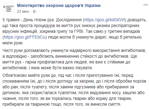 Об этом Минздрав сообщил в Facebook уточнив, что 5 мая в мире отмечается День гигиены рук.