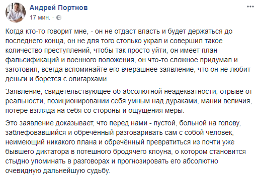 Это заявление доказывает, что перед нами - пустой, больной на голову, заблефовавшийся и обречённый разговаривать сам с собой человек, неимеющий никакого плана и обречённый превратиться из почти уже бывшего диктатора в потешного бродячего клоуна, о котором становится стыдно упоминать в разговорах и прогнозировать его абсолютно очевидную дальнейшую судьбу", - написал Портнов.