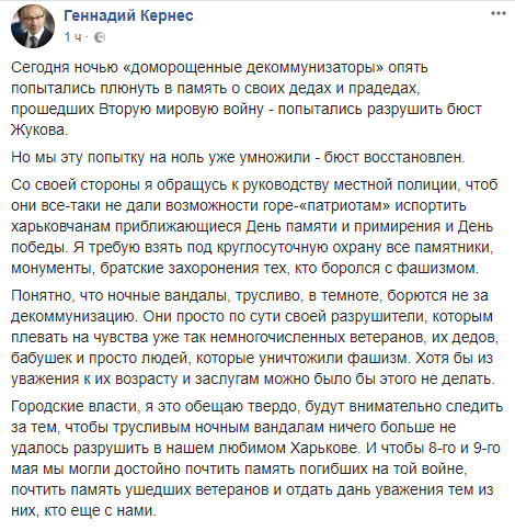 "Сегодня ночью "доморощенные декоммунизаторы" опять попытались плюнуть в память о своих дедах и прадедах, прошедших Вторую мировую войну - попытались разрушить бюст Жукова. Но мы эту попытку на ноль уже умножили - бюст восстановлен", - отметил он.