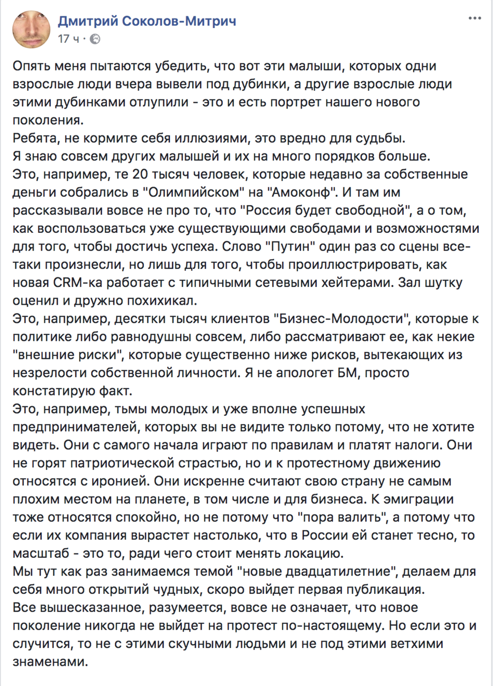 "Опять меня пытаются убедить, что вот эти малыши, которых одни взрослые люди вчера вывели под дубинки, а другие взрослые люди этими дубинками отлупили - это и есть портрет нашего нового поколения, - пишет известный российский журналист, в последние годы ушедший в свой бизнес, Дмитрий Соколов-Митрич. - Ребята, не кормите себя иллюзиями, это вредно для судьбы.