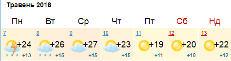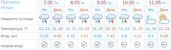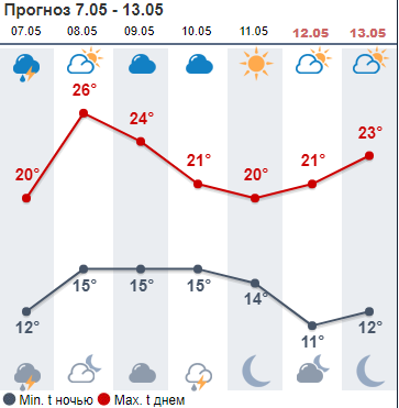 Ресурс Мeteoprog.ua обещает дождь только в понедельник, 7 мая. Вторник, 8 мая, будет теплым, до +26. В остальные дни недели +20...+23.